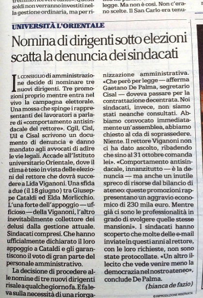 Università L'Orientale '' nomina dirigenti sotto elezioni, scatta la denuncia dei sindacati''