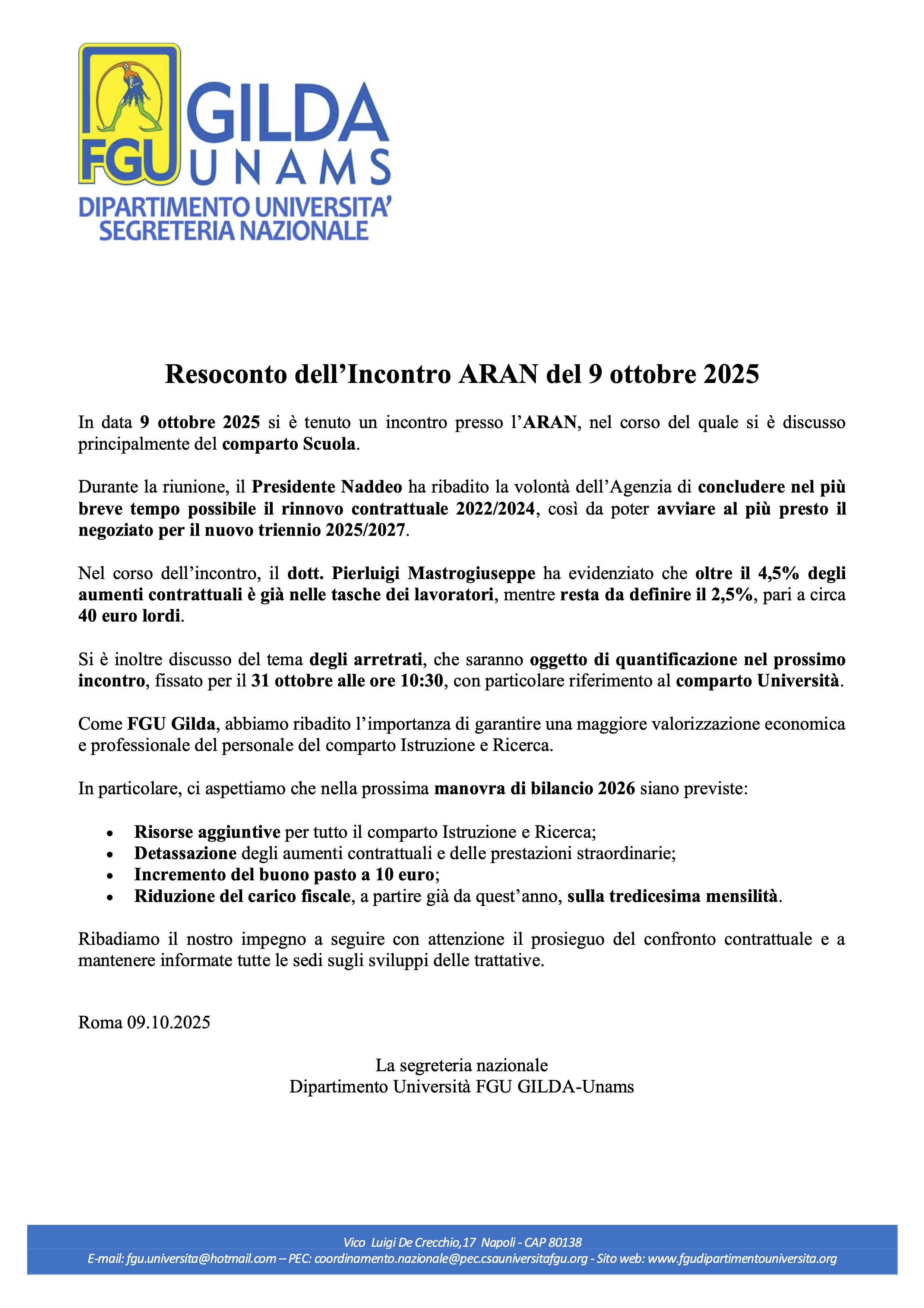 Comunicato Nazionale - resoconto incontro ARAN del 31 ottobre 2025 sul rinnovo del CCNL 2022-2024 – Sezione Università